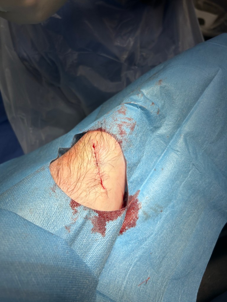 The procedure starts, and I must say I was a bit surprised by it. If you haven’t had a procedure like this, you may be expecting that there will be a big screen hiding the op from the patient (me). No. No. No. What happens is you sit on a seat, put your arm on a rest and then the doctor cracks on. I’m a wimp when it comes to blood and gore so there is no chance I can watch this, so I turn my head to the right for the next 15 mins or so as the procedure goes on. I think I can still memorise what was written on the wall I was staring at. The other thing to mention, if you haven’t had anaesthetic before is that the bugger stings. Turns out the anaesthetic is vinegar according to Doctor Ben. No wonder it stings! So, Doctor Ben is doing his stuff, I can’t feel a thing other than an occasional prod/pull of my arm. After 10 mins or so, he says that the whole area has been removed from my arm and asks if I want to take a look before the area of skin gets tested. No chance pal!