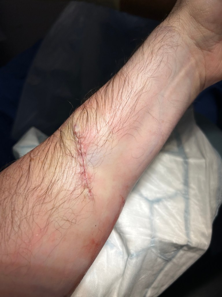 He then tells me that he is now going to start stitching me back up and then we are all done within 15-20 minutes which I personally think was pretty impressive. But Doctor Ben tells me that this is a pretty standard procedure and he does them all of the time. Off he goes (home I think because it’s now passed 5pm) and he says hello to Lisa on the way out and tells her that the procedure was a success and that I should have results from the tests in a few weeks. I find Lisa, it’s not hard cos she’s the only one in the waiting area, and I tell her what has happened. As always she is the sensible one and says that I am better off having the whole area taken off my arm today rather than having more weeks to think/worry about it getting chopped off in a few weeks time. She is totally right of course!
